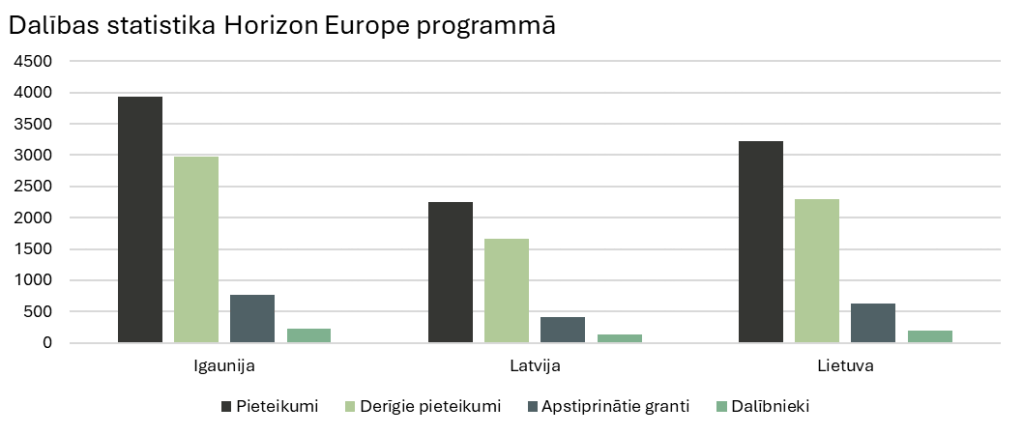 Kā zināms, lai gūtu panākumus, ir jāmēģina – reizēm atkal un atkal. Horizon Europe panelis rāda arī dalības rādītājus pašreizējā programmā. Uz 2025. gada 8. augustu Latvijai ir zemākie dalības rādītāji Baltijā un vairākos parametros tie ir gandrīz divreiz mazāki nekā Igaunijai.