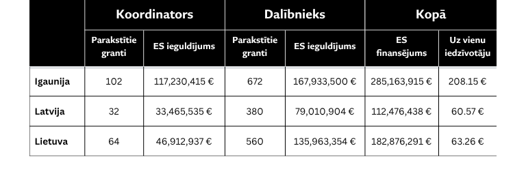 Atšķirība kļūst īpaši redzama projektu vadībā. Igaunija ir līdere ar 102 koordinētajiem projektiem, Lietuva seko ar 64, bet Latvijai ir tikai 32. Šīs koordinatoru lomas ir izšķirošas, jo tās nosaka projektu stratēģiju un nodrošina lielāku finansējuma daļu. Pretstatā tam Latvijas 380 dalības projektosbieži vien aprobežojas ar šaurākiem darba uzdevumiem, kas sniedz mazāku finansiālo un stratēģisko pievienoto vērtību.